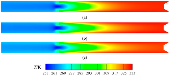 Figure 6 shows the total temperature distribution along the Y-Z axial cross-section of three vortex tubes. The gas temperatures at the cold outlet and hot outlet of three vortex tubes are listed in Table 3. In Figure 6, following the energy separation in vortex tubes, the gas temperature at the hot outlet in the center gradually decreases toward the separation orifice plate, while the gas temperature gradually increases from the center of the vortex tubes toward the wall. The cold gas flows through the central hole to the cold tube, and the hot gas flows out through the hot annular gap along the wall.