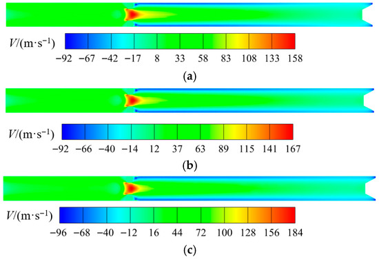Figure 8 shows the contour plot of axial velocity distribution in the vortex tube, revealing a distinct reverse flow phenomenon within the device. As observed from the figure, the direction of axial velocity reverses completely from the central axis to the peripheral region. Specifically, the outer periphery exhibits hot fluid flowing from the cold-end orifice plate toward the hot-end exit, while the core region shows cold fluid moving backward to the cold-end orifice plate due to the obstruction effect of the hot-end control valve. In terms of maximum axial velocities, the straight-channel nozzle vortex tube achieves 92 m/s for hot fluid and 158 m/s for cold fluid; the converging nozzle configuration maintains 92 m/s for hot fluid while increasing cold fluid velocity to 167 m/s; whereas the converging–diverging nozzle design further enhances the performance with hot fluid reaching 96 m/s and cold fluid attaining the highest velocity of 184 m/s.