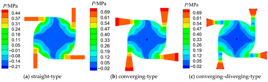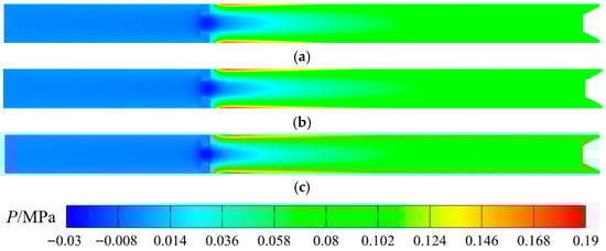 The pressure distribution in the cross-section of nozzles is shown in Figure 9. It indicates that in the straight-type and converging-type nozzles, the pressure of airflow continuously decreases, and the velocity continuously increases from the nozzle inlet to the tangential region of the vortex chamber. In the converging–diverging-type nozzles, the airflow expands to a very low pressure in the diverging section of nozzles, reaching a supersonic state. Then it decelerates and increases the pressure near the nozzle outlet. And secondary expansion and acceleration occur.