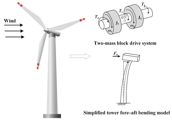 (3) Tower dynamics. Pneumatic thrust causes flexible deformation in the front and rear of the tower, resulting in displacement of the tower top . Therefore, the tower is represented as a spring–damping–mass system.