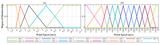 To achieve the dynamic performance, multiple MPC is designed based on the model bank. Each local MPC controller is designed according to the instantaneous wind speed. However, the controller switching would result in instability. To overcome this, a hybrid membership function is proposed to suppress the sudden control change and smooth the controller output. In Figure 3a, it is seen that a set of triangular functions is constructed based on the steady-state points from MPC2 to MPC4. Meanwhile, a set of trapezoidal functions is established based on the steady-state points for MPC1 and MPC5, and together, they form a hybrid membership function for the partial-load region. Similarly, the membership function of the full-load region is also constructed, as shown in Figure 3b. To ensure local MPC control accuracy at its designated wind speed, positioning the support points and peak point of the triangular membership function at adjacent model wind speeds and the current model wind speed, respectively, is optimal. This applies equally to the trapezoidal membership function. Trapezoidal functions are placed at operating region boundaries (partial- and full-load regions) because while entering or exiting these regions, model switching is unnecessary, and the function output must remain at unity. Then, a smooth transition of weights from 1 to 0 and back to 1 is achieved between adjacent functions. These seven membership functions facilitate a soft-switching strategy for the MMPC, which is defined as soft switch multiple MPC. Figure 4 presents the structure of SSMMPC. The detailed implementation is shown in Algorithm 2.