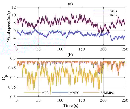(1) Maximum Power Point Tracking. Figure 5 shows the simulation results of the wind profiles generated by TurbSim with a turbulence intensity of 0.15 for both winds, and the maximum power point tracking of the wind turbine at a mean wind speed of 8 m/s. The MPC in this case is designed based on the 5.5 m/s steady-state point; hence, the value of the MPC in Figure 5b is much less effective than the MMPC and SSMMPC in tracking the maximum power coefficient point under 8 m/s turbulent wind. Table 2 and Table 3 show the root mean square errors (RMSE) and mean absolute errors (MAE) of the tracking for different wind speeds, respectively. The percentage shown means the degree of reduction compared to MPC. From 5 m/s to 8 m/s, the larger the average wind speed, the larger the standard deviation of the wind profile, which leads to a larger wind speed span and a larger range of turbine operating points, reinforcing the advantage that the MMPC can be freely switched at various operating points. Obviously, the RMSE of MMPC and SSMMPC relative to MPC is significantly reduced by 78.32% simultaneously when the input wind speed becomes 8 m/s, while the MAE is reduced by about 84% at the same time. This sufficiently indicates that the proposed SSMMPC inherits the advantages of MMPC and provides stable tracking of the maximum power point.