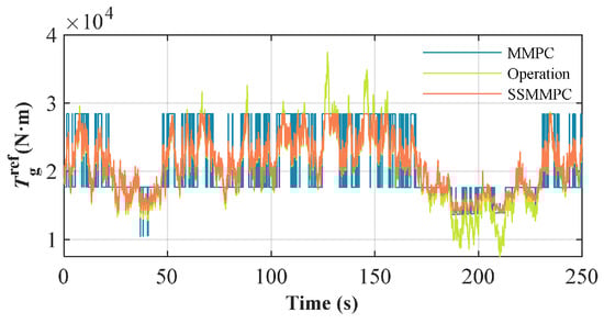 (2) Control Signal Oscillation Suppression. Figure 6 illustrates the variation of control signals for SSMMPC and MMPC under 8 m/s turbulent wind. Since the steady-state point of is not fixed in the partial-load region, the slave MPC can only guarantee the tracking state at its own designed operating point, which results in the control signals oscillating frequently among the three MPC signals when the MMPC is switched. SSMMPC relies on the membership function to achieve stable tracking of the operating point and smooth switching of the controller signals, which is particularly evident between 50 s and 170 s in Figure 6. Overall, the control signal of the SSMMPC is more stable than that of the MMPC, allowing better tracking of the operating point.