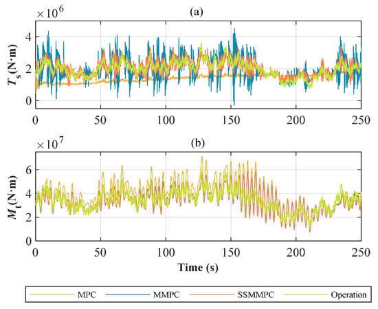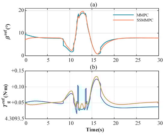 Comparison of control signals between MMPC and SSMMPC: (a) ; (b) .