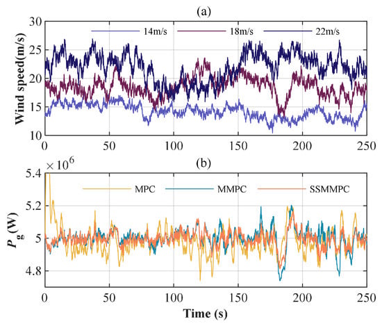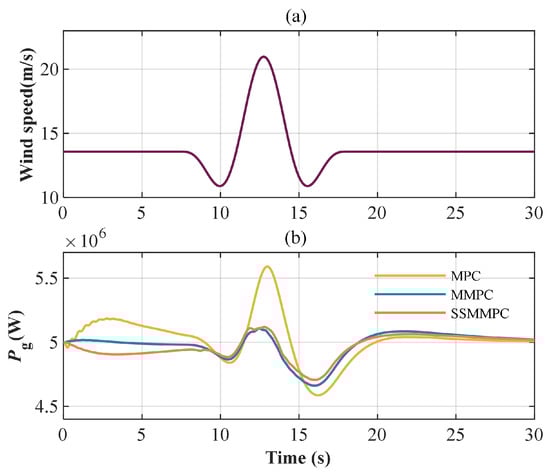 Distinct from turbulent winds, extreme operating gusts vary dramatically over short periods of time. To verify the adaptability of SSMMPC, the time-domain responses of different control strategies are compared under extreme gust conditions. According to the IEC61400 standard [24], an extreme operating gust time series is created with an incoming wind speed of 13.5 m/s and a gust amplitude of 10 m/s at the hub height, as shown in Figure 14a, where = 10.5 s is the gust period.