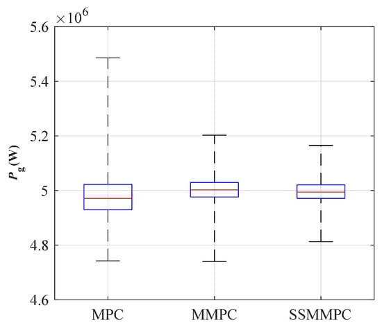 (1) Power Reference Tracking. In this case, simulations were performed under turbulent winds with mean values of 14 m/s, 18 m/s, and 22 m/s (Figure 8a), and the results for 18 m/s are plotted. To visualize the data distribution, Figure 9 presents the box and whisker plot of the output power. It is found that the median of MPC is furthest away from the 5 MW reference value due to the limited ability to track at non-designed operating points. The box height of the SSMMPC is close to that of the MMPC; however, the end lines are shorter. This indicates that the data is more centralized and the reference power tracking is more effective. The advantages of the proposed method in power tracking are confirmed again.