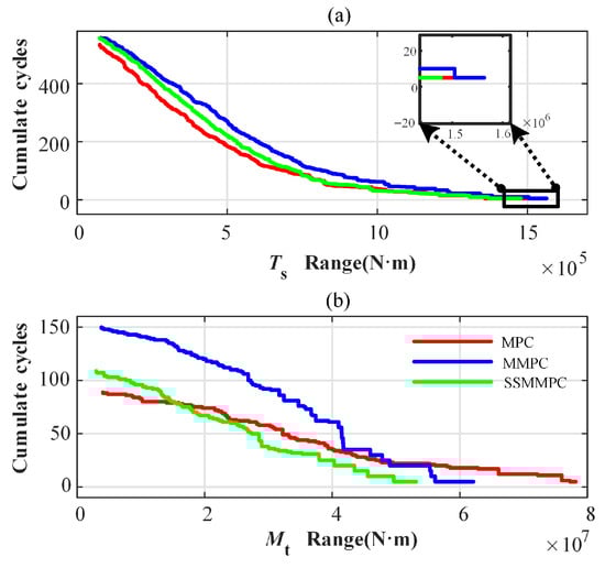 (3) Fatigue Load Reduction. Figure 12 presents a comparison of the main shaft torque and tower bending moment with three different strategies. It is found that the hard-switching MMPC leads to a more pronounced fluctuation compared to SSMMPC due to control signal ripple. Table 8 shows the DELs of and . SSMMPC exhibits the strongest robustness in fatigue load reduction under different turbulent wind speeds. Specifically, when the turbulent wind speed is 18 m/s, the DELs of for MMPC and SSMMPC are decreased by 20.33% and 32.96% compared with MPC. Comparably, MMPC’s has a higher DEL than MPC, negatively attributed to MMPC switching oscillations. Excitingly, SSMMPC successfully limits the effect of MMPC’s oscillation on , which is optimized by 15.84% at 14 m/s, but the DEL is almost equal to that of MPC. Besides that, the cumulative rainflow cycle in Figure 13 confirms that SSMMPC is beneficial for reducing cycles for both and , suggesting that the fatigue loads on the wind turbines are suppressed.
