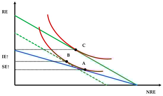 Hypothesized effects of the changing relative prices of renewable and non-renewable energy. RE—renewable energy; NRE—non-renewable energy; SE—substitution effect; IE—income effect; A, B, and C—tangency points of the indifference curves with the budget lines.