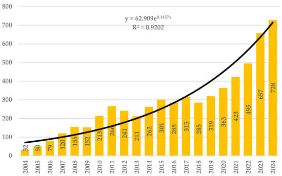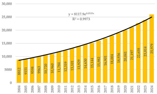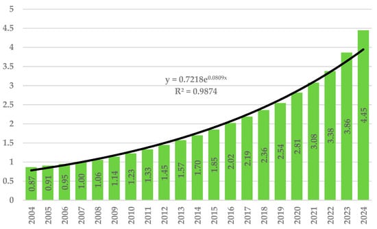 Investments in energy production can be analyzed from the physical and financial points of view. In the first case, developments in energy generation capacity can serve as a proxy indicator, whereas in the second, financial outlays serve as a proxy. The increasing importance of renewables is especially clear regarding electricity capacities. The changing levels of global renewable energy electricity capacity in 2004–2024, as reported by IRENA [20], are presented in Figure 2.