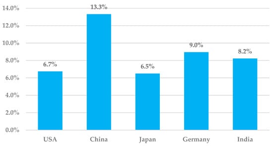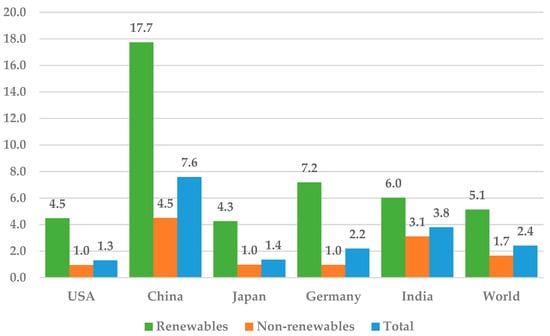 China had the highest CAGR for the period considered, exceeding 13%. Germany had the second highest CAGR, which was, however, considerably lower. The results for India and Japan are even less impressive but are still above the global rate, 7.4%. For Japan and the USA, the calculated CAGRs are somewhat below this value. However, given the fact that in 2022, generation from renewable sources surpassed coal-fired generation in their electric power sectors for the first time, investments into increasing their renewable energy electricity generation capacities are likely [23].