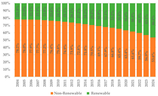 Shares of non-renewables and renewables in the total installed global electricity capacity in 2004–2024.