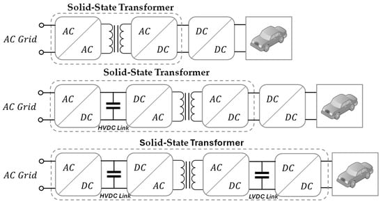 As shown in Figure 1, classical SST topologies are generally classified by the number of conversion stages into single-, two- and three-stage variants as follows: a single-stage topology is the simplest, yet the absence of a DC link precludes power-factor correction (PFC) and bidirectional power flow, severely limiting its suitability for high-power scenarios; a two-stage topology introduces an intermediate DC link that partially mitigates harmonic distortion, but the complex multilevel configuration and soft-switching difficulty at high voltage still constrain gains in efficiency and reliability, and the lack of a high-voltage DC (HVDC) link hinders the integration of distributed energy resources; a three-stage topology, building on the first two, further incorporates HVDC and low-voltage DC (LVDC) links and thus offers clear advantages, including support for vehicle-to-grid (V2G) operation, a marked reduction in total harmonic distortion (THD to <5%), and convenient integration of photovoltaic and energy-storage systems, thereby steering charging stations toward higher efficiency and lower carbon emissions [8,9,10].