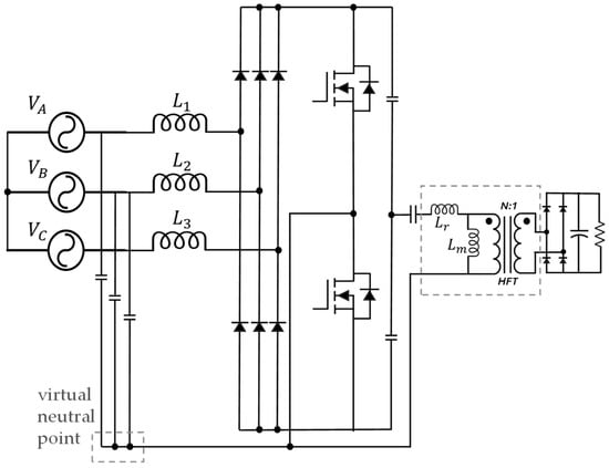 Driven by the demand for efficient energy conversion, resonant converter topologies in SST are gradually emerging as key solutions for UFCS systems. As shown in Figure 2, the early TAIPEI rectifier combined a two-switch discontinuous conduction mode (DCM) boost stage with a virtual neutral point to achieve low input THD and soft commutation, yet its low-voltage, two-stage configuration imposed clear limits on efficiency and power density [23].