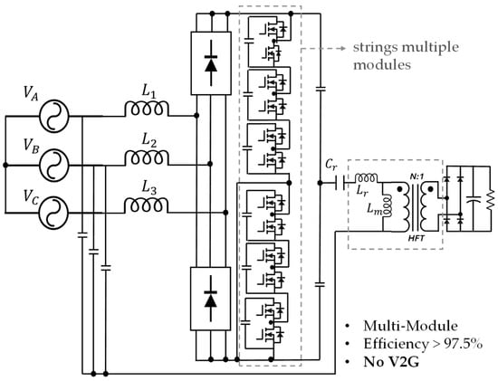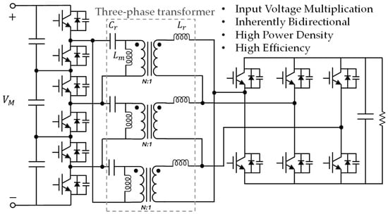 To accommodate medium-voltage operation, subsequent research merged the rectification and resonant stages into a single-stage design. As shown in Figure 3, the three-phase HBC integrated with an LLC resonant tank [24] strings multiple modules to share voltage stress and delivers system efficiencies above 97.5%, exemplifying the trends toward structural integration and loss reduction.