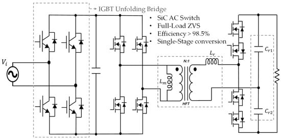 Most of these schemes, however, remain restricted to unidirectional power flow, limiting their potential for interaction-oriented UFCS use cases such as V2G. The work by Xu et al. [25] breaks this barrier by proposing a single-stage AC/AC converter that couples a half-bridge LLC resonant network with SiC AC switches, as shown in Figure 4. Eliminating the intermediate DC link, the system achieves an efficiency of over 98.5% through full-load zero volt switching (ZVS) and adaptive dead-time control, while natively supporting bidirectional energy transfer in hardware.