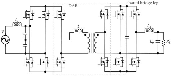 In the former, the Hybrid DAB, as shown in Figure 6, shares legs between half- and full-bridge sections, sharply reducing the switch count, raising power density, and mitigating power pulsations, though secondary-side ZVS still needs improvement [29].