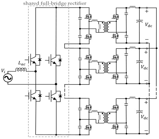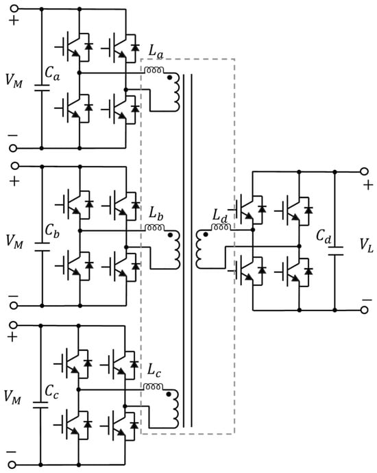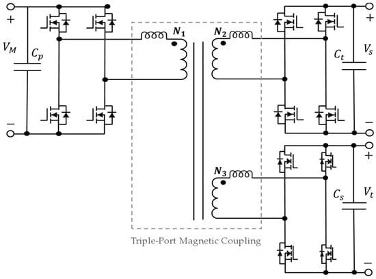 On the other hand, a triple-active-bridge (TAB) topology employs a three-port magnetically coupled structure, as shown in Figure 9, enabling integrated and coordinated connections among the vehicle, grid, and energy storage systems within a single module. This approach significantly simplifies the conventional multi-port fast-charging systems, which typically require multiple parallel DAB modules. Centered around a three-winding high-frequency transformer and combined with three bridge-arms forming the power conversion channels, the TAB topology exhibits excellent port expandability and structural compactness, thereby enhancing the utilization of magnetic components and providing greater flexibility in control [32,33].