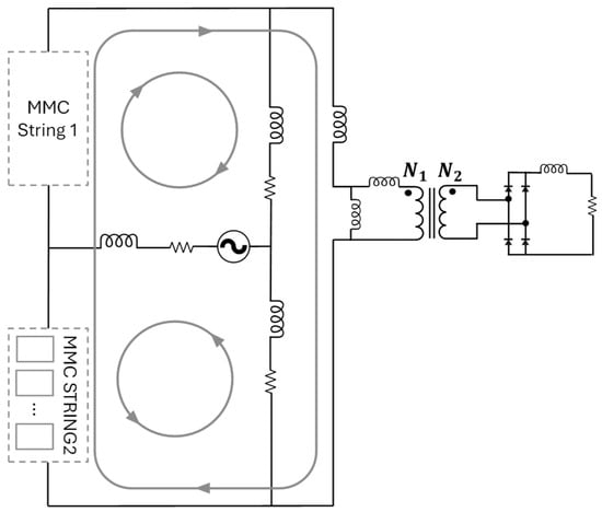 Fourthly, the synergy between modular structures and control strategies is predominantly exemplified by the MMC family. As shown in Figure 10, Figure 11, Figure 12, Figure 13 and Figure 14, MMCs have been extensively utilized in medium-to-high-voltage conversion scenarios due to their modular scalability, high reliability, and excellent waveform quality [50,51]. In SST-based ultra-fast charging applications, although traditional three-stage MMC topologies provide good waveform quality and stability, their power density and system complexity have become notable bottlenecks [52,53]. To address these challenges, researchers have introduced various innovative solutions based on MMC submodule restructuring and power-path optimization, aiming to enhance overall efficiency and power density. For instance, the 2-String 2-Inductor (2S2I) MMC topology in Figure 10 effectively reduces both the number of submodules and the dependence on high-voltage-side capacitors through an innovative series-parallel submodule design and direct integration with high-frequency transformers, significantly reducing losses and system volume. Additionally, this structure decouples the low-frequency grid interaction from high-frequency power transmission via current-fed and differential-mode power transmission paths, thus offering a higher power-density solution suitable for ultra-fast charging scenarios [54].