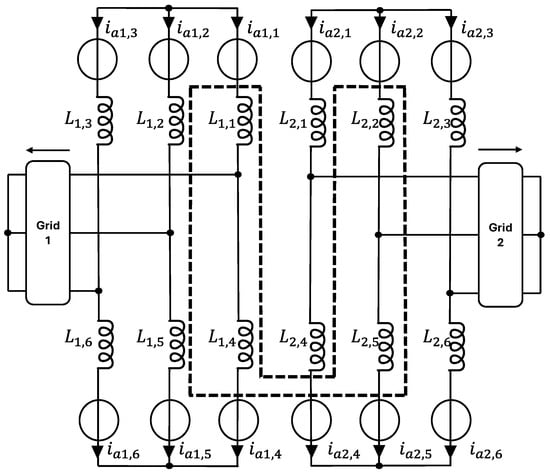 The FDAB-MMC topology (FM2C-SST) in Figure 13 introduced by Teng et al. [58] achieves horizontal three-submodule magnetic coupling interconnections through four-port dual-active-bridge (FDAB) structures, reconstructing SM capacitors into switched capacitor networks. This approach notably reduces the required capacitance values and naturally suppresses arm circulating currents through ripple self-cancelation, greatly enhancing power density.