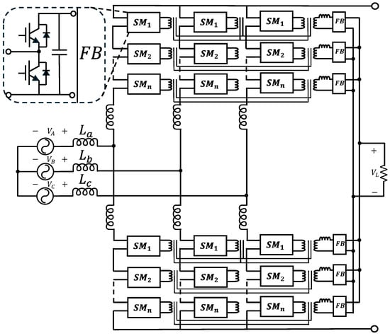 Type B MMC topologies replace traditional two-level submodules (SM) with three-level NPC or cascaded half-bridge submodules, markedly reducing the component count. Moreover, the low-voltage DC (LVDC) outputs are realized through series-parallel reconfiguration at the DAB side, enabling multi-voltage outputs [55]. Further advancements in power density have been achieved through magnetically coupled MMCs and bridge-arm reconstruction approaches. As illustrated in Figure 11, these methods utilize single-core magnetic coupling for electrical isolation, enhancing topology compactness and scalability. However, they require introducing multi-frequency energy balancing mechanisms to maintain system stability [56].