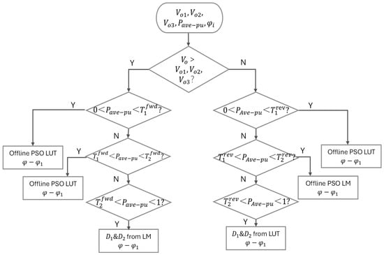 where represents power density, denotes efficiency, is a normalized metric combining both efficiency and power density, and is the total number of design candidates. Building on this, the same group derives closed-form expressions for the pulse width and phase shift , achieving real-time modulation without look-up tables or iterative computation; This scheme maintains near full-cycle ZVS within a certain load range and significantly reduces the computational burden of control [72]. Together, these studies establish an integrated “offline η–ρ optimization–online analytical modulation” methodology. It should be noted, however, that the experimental validation remains limited to single-phase kilowatt-scale prototypes, whereas scalability to multi-port, three-phase, high-power systems as well as compatibility with system-level coordination still requires verification.