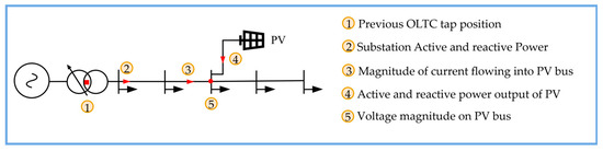 The input features used for the proposed DNN models are illustrated in Figure 1, which shows their relation to the distribution system in a simplified form. These include: (1) the previous OLTC tap position, which provides information about the transformer’s configuration and serves as a baseline for predicting the next tap adjustment; (2) the feeder active and reactive power at the substation, representing the overall loading condition and the power exchange with the upstream grid; (3) the magnitude of branch currents flowing into PV buses, which reflects local power flow patterns and loading conditions; (4) the active and reactive power outputs of PV inverters, indicating their real-time contribution to the grid and remaining reactive capability; and (5) the voltage magnitudes at PV buses, serving as direct indicators of the local voltage profile and highlighting buses that may require corrective action. The figure illustrates a single PV connection for clarity; however, if additional PV units are connected to the network, the corresponding features (3)–(5) for those PV buses are also included in the DNN input set.
