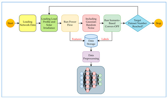 The workflow for generating the training dataset used in this study is illustrated in Figure 2. The process begins by loading the distribution system model, including line and bus parameters, as well as PV and OLTC configurations. Next, load profiles and solar irradiance data are imported to establish the baseline operating conditions. A power flow analysis is then conducted to obtain the pre-optimized state of the distribution system, and selected results from this step are recorded as input features for training.