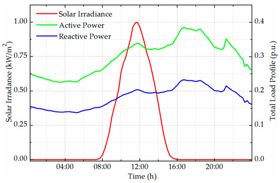 To evaluate the performance of the proposed method, historical daily bus-level load data were used. Figure 5 illustrates the total active and reactive power of all buses over time, along with the corresponding solar irradiance profiles. The dataset represents a full day of operation with a 15–minute time resolution, capturing typical variations in both load demand and solar generation. The active and reactive loads exhibit morning and evening peaks, while the solar irradiance profile follows a bell-shaped curve during daylight hours, providing diverse operating conditions for testing the proposed framework.