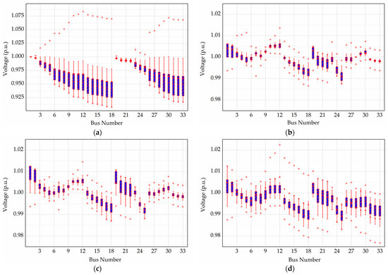 Voltage profiles from testing different OPF methods. (a) no OPF; (b) deterministic convex-CCOPF; (c) scenario-based convex-CCOPF; (d) DNN-based OPF.