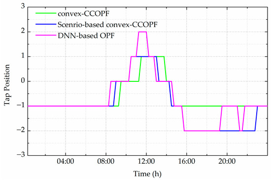 Tap position profiles of the OLTC under different OPF methods.