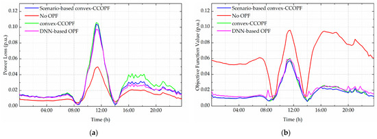 Figure 8 illustrates the loss profiles and objective function values for the four OPF methods, while Table 2 summarizes their total daily energy losses. The no-OPF case records the lowest total energy loss of 3.56 MWh, since no control actions are imposed on the system. However, as shown in Figure 8b, this case results in the highest objective function value due to severe voltage fluctuations and repeated violations of operational constraints. By contrast, the convex-CCOPF, scenario-based convex-CCOPF, and DNN-based OPF methods achieve improved voltage regulation and secure operation, reflected in much lower objective function values. Their corresponding total energy losses are 6.43 MWh, 5.84 MWh, and 5.63 MWh, respectively. Although these values are higher than the no-OPF case, they represent a necessary trade-off between minimizing losses and ensuring feasibility under voltage and thermal constraints. Among them, the proposed DNN-based OPF achieves the lowest energy loss while maintaining real-time applicability, demonstrating its potential as a practical solution for large-scale deployment.