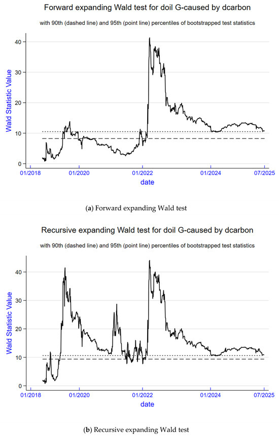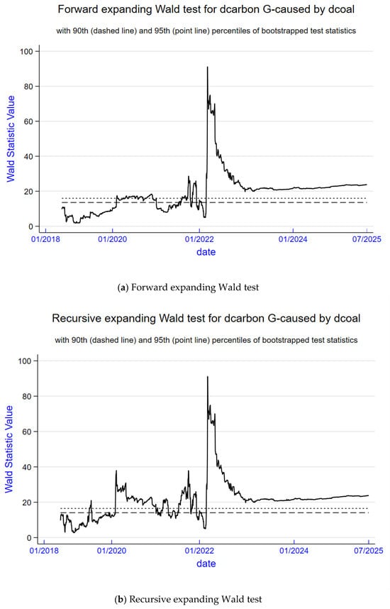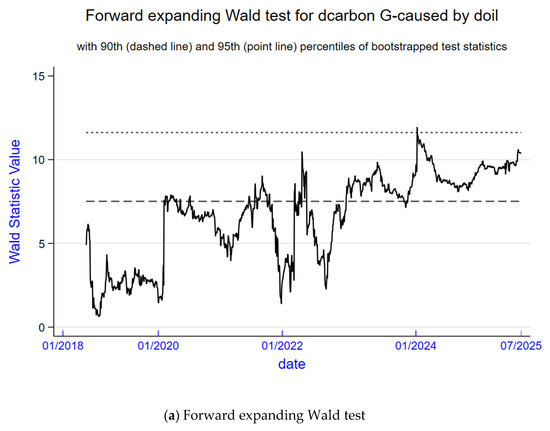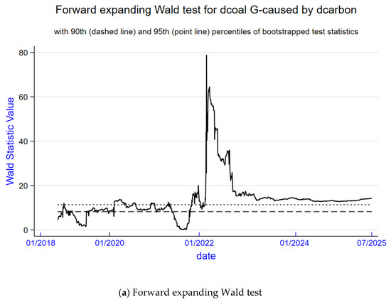 To complete the study of the causal relationship between oil, coal, and carbon prices using forward, rolling, and recursive evolving algorithms, the optimal lag order of the original VAR model must be determined. In this paper, we utilize BIC to select the optimal lag order, and the maximum lag order is 12. The optimal lag order was chosen to be 4, which is used in all subsample regressions. The minimum window size is set to include 72 observations (approximately 2.5 months). Each subsequent graphical result contains the value of the Wald test statistics and their corresponding 90th and 95th quantiles. When the value of the Wald statistic exceeds the critical value of the sample, it is considered that there is a causal relationship between the economic variables; otherwise, it indicates that the null hypothesis of no causal relationship cannot be rejected.
