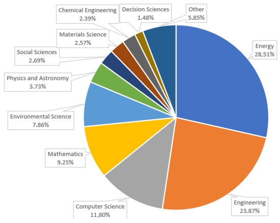 At its core, the HRES optimization problem is one of constrained decision-making under uncertainty [16]. The goal is to select the best possible combination of system components and operational rules to achieve a set of desired outcomes, given the physical limitations of the equipment and the unpredictable nature of renewable resources and energy demand [17]. The structure of the system itself, both physically and logically, fundamentally shapes the nature and complexity of this optimization task. Articles found classified by finding sponsor, country/territory, and subject area are shown in Figure 2, Figure 3 and Figure 4, respectively.