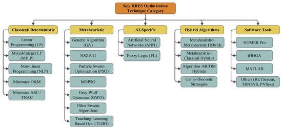 The architecture of an HRES dictates the pathways of energy flow and the nature of interactions between components, thereby defining the foundational structure of the optimization model. The selection of a particular architecture introduces specific constraints and variables that must be considered [18]. A clear understanding of these architectural choices is therefore the first step in formulating a coherent optimization problem. A schematic diagram, such as the one proposed in Figure 5, can effectively illustrate these architectural differences. The composition of an HRES can be diverse, tailored to specific geographical, economic, and load requirements [18]. However, several key components are typically encountered [19]: