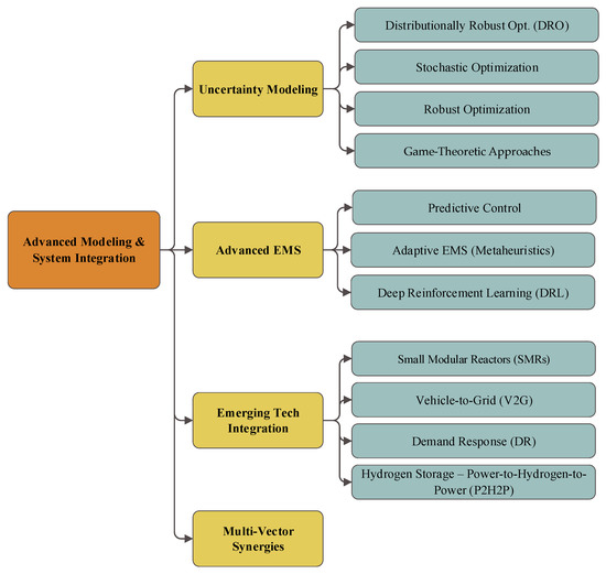Beyond the physical layout, the logical or control architecture dictates how the optimization problem is structured and solved. Two primary approaches exist. Centralized architecture formulates a single, comprehensive model that solves for both the long-term planning variables (sizing) and the short-term operational variables (dispatch) simultaneously [23]. In theory, this can yield a globally optimal solution because it captures the intricate feedback between design and operation. However, the resulting model is often a large-scale, non-linear, mixed-integer problem that is computationally intractable for complex systems. Layered (or hierarchical) architecture decouples the problem into distinct layers, typically a “planning/sizing layer” and an “operation/dispatch layer” [43]. The sizing is determined first, often based on simplified operational assumptions, and then a detailed Energy Management System (EMS) is designed for the chosen configuration [44]. This method offers greater flexibility and is computationally more manageable, but it may lead to a suboptimal overall solution as the full interplay between sizing and operation is not captured.
