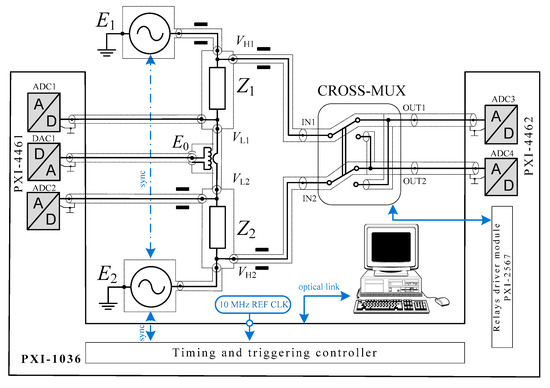 In the bridge structure, two PXI modules were employed (see 1 in Figure 2). The PXI-4461 includes two analog-to-digital channels and two digital-to-analog channels. The analog-to-digital channels AI0 and AI1 operate as digitizers, denoted as ADC1 and ADC2, respectively, while the digital-to-analog channel AO0 functions as a sinusoidal signal generator, denoted as DAC1. In turn, the PXI-4462 module provides four analog-to-digital channels, two of which are used as digitizers ADC3 and ADC4. The measurement of the voltage ratio is carried out by sampling the voltages VH1 and VH2 using two digitizers, ADC3 and ADC4, switched by means of the cross-multiplexer (CROSS-MUX) designed and fabricated at SUT. The DAC1 delivers a sinusoidal signal, synchronized with E1 and E2, to compensate for the voltage drop across the connecting cable between two resistors. The system is designed as fully coaxial to ensure high immunity to electromagnetic interferences. Details on the synchronization and balancing of the bridge are provided in [17].