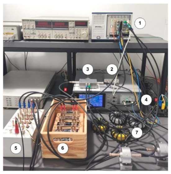 Implementation of the sampling-based bridge: 1—NI PXI sampling system, 2—optical-to-TTL converter, 3—a new CROSS-MUX, 4—digital AC voltage source, 5—4TP thermostatized capacitance standards, 6—4TP Vishay resistance standards, 7—current equalizers (chokes).