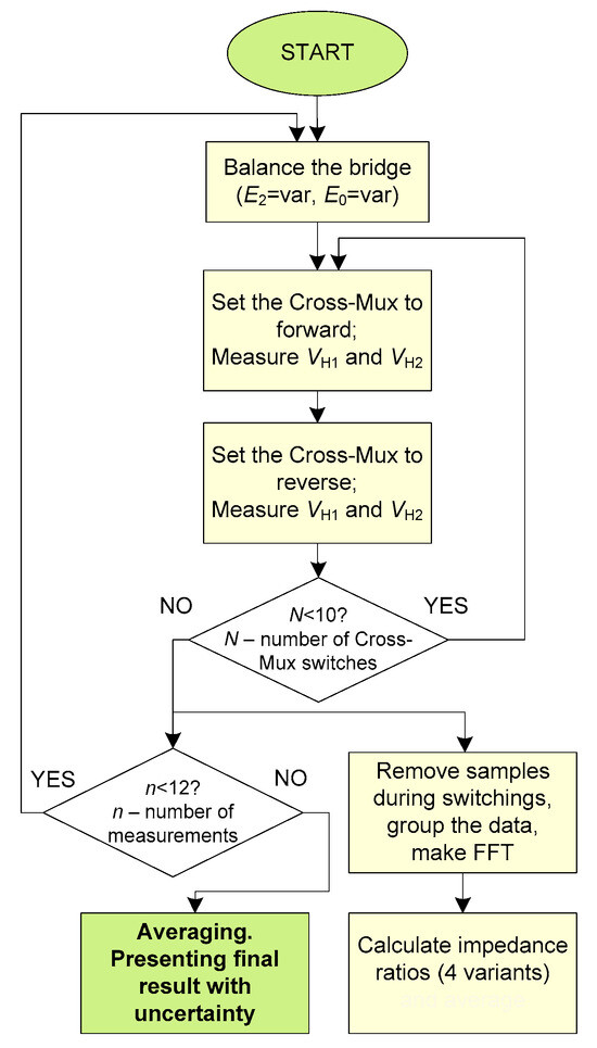 As shown in Figure 1, the sampling bridge is fully computer controlled. A LabVIEW program manages the data acquisition process. The data transfer between the PXI modules and the computer is conducted via an optical link, ensuring good electrical insulation. The flow chart of the new measurement procedure based on the presented method of determining the voltage ratio is presented in Figure 4. A Quasi-Newton method [21] is implemented in the software for balancing the bridge. Voltages VH1 and VH2 for each mode (forward and reverse) are sampled for 500 ms at a frequency as close as possible to the maximum permissible value, which for PXI-4461 and PXI-4462 is 204.8 kSa/s. The sampling frequency is always selected to ensure coherent sampling. Typically, 10 switching sequences (each sequence consists of at least 20 periods) are taken for analysis after removing samples received at the time of CROSS-MUX switching. RMS voltages are calculated using DFT. The entire measurement procedure is repeated 12 times. Excessive error (outliers) removal using the Dixon method and statistical methods allows for the detection of any gross errors, and ultimately, 10 results are considered to determine the final impedance ratio value. Furthermore, the standard deviation is determined, which is used to estimate Type A uncertainty.