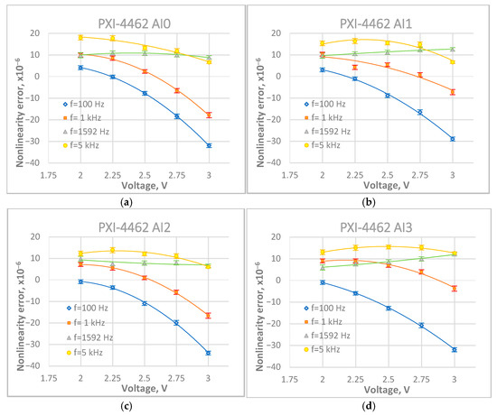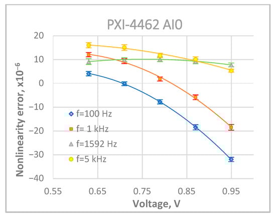 It was observed that both the shape of the characteristics and the values of the nonlinearity errors of the PXI-4462 AI0 digitizer for the 1 V range (Figure 7) correspond to those obtained for the 3.16 V range (Figure 6a). This indicates that the nonlinearity of the digitizer originates from the A/D converter itself rather than from the input circuitry (amplifiers and dividers).