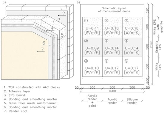 A sample of a two-layer wall with ETICS insulation with an area of 160 × 202 cm was made. The structural layer of the wall was made of 12 cm thick cellular concrete blocks with adhesive mortar. Then, a 20 cm thick layer of thermal insulation made of polystyrene foam boards fixed with adhesive mortar was attached to the wall layer. For comparison purposes, three types of polystyrene foam were used, laid in 50 cm wide horizontal strips, with different thermal conductivity coefficients λ: