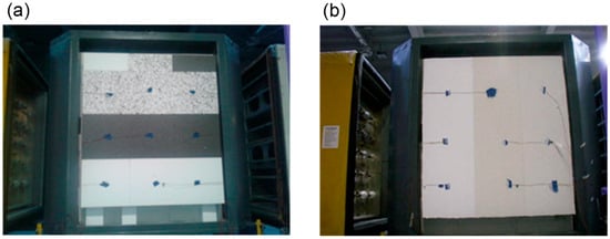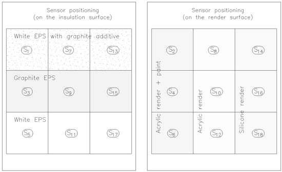 The test specimens were prepared as ETICS (External Thermal Composite Insulation System)-type external wall insulation systems. The prepared system of nine specimens, with different layers of polystyrene and plaster, was built over the entire surface of one of the walls of the central exhibition chamber with an area of 1.6 × 2.1 m (as described in chapter 2.1.). In order to collect measurement data of the heating temperature of the plaster in the central point of each sample (50 × 50 cm field), thermocouple-type sensors were installed in the flush-mounted layer and on the render surface (Figure 2 and Figure 3). Individual sensors were connected to an Ahlborn Therm 5500-3 multi-channel recorder (Holzkirchen, Germany). In this way, the test samples, together with the recording system, were prepared for testing.