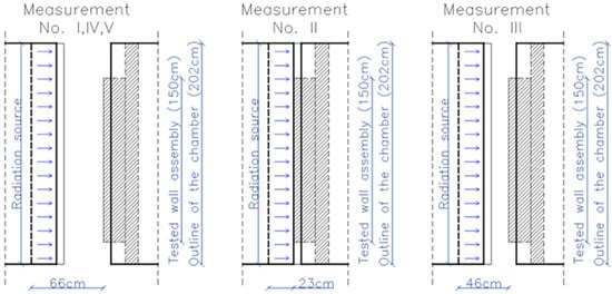 The tests were repeated five times to verify the results and assess the effect of varying the position of the radiation source on the temperature distribution on the partition surface. The distance of the light source from the test surface was changed three times, while the material properties and geometry of the partition were unchanged. The test was carried out with the lamps positioned at distances from the test surface of the partition equal to 66 cm, 23 cm, and 45 cm (Figure 4):