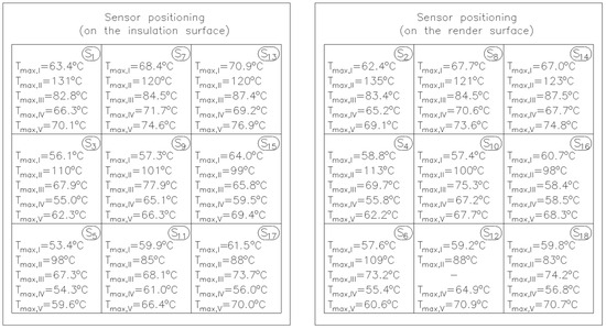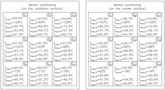 A comparison of the maximum temperatures recorded on the surface of the façade render and on the insulation (Figure 19 and Figure 20) revealed significant differences in the thermal behavior of the tested material assemblies. In many cases, the render surface reached higher temperatures during the initial phase of radiation exposure due to its direct exposure to the heat source. However, with prolonged heating and increased thermal load, the temperature on the insulation surface occasionally exceeded that of the render—indicating heat accumulation in the deeper layers of the wall assembly. The final temperature distribution was thus the result of both the individual material properties and their interactions within the entire system.