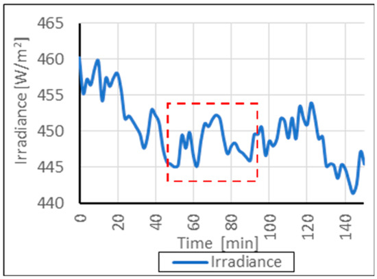 Variation of the solar radiation intensity over time. The area marked in red is enlarged in Figure 7.