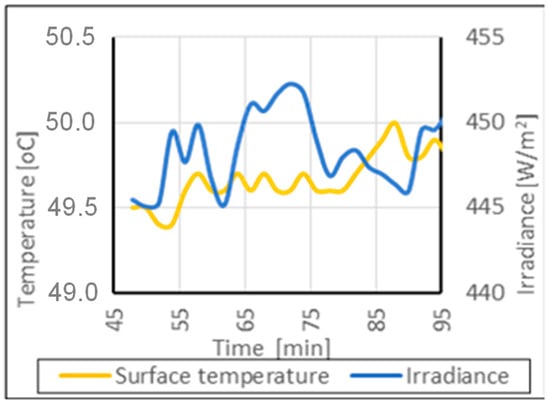The recorded temperature fluctuations on the surface of the wall section exhibited a clear correlation with the observed variations in irradiance. This relationship is illustrated in Figure 7 (a fragment of the measurement presented in Figure 6), where it is evident that a decrease in irradiance resulted in a temperature drop, while an increase in irradiance led to a renewed rise in surface temperature.