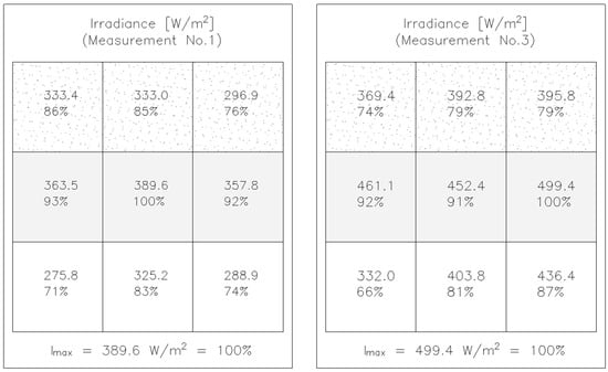 Temperature corrections were performed based on the irradiance distribution pattern shown in Figure 8 (where for Measurements I, II, IV, and V: 100% = 389.6 W/m2, and for Measurement III: 100% = 499.4 W/m2), with the adjusted results presented in Figure 9.