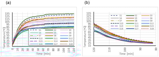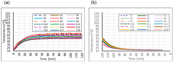 The graphs captured both the heating phase, resulting from exposure to the radiation source (Figure 10a and Figure 11a), and the cooling phase following its deactivation (Figure 10b and Figure 11b). This dual-phase representation enabled the analysis of both the intensity of the thermal response and the thermal release capability of the tested material assemblies.