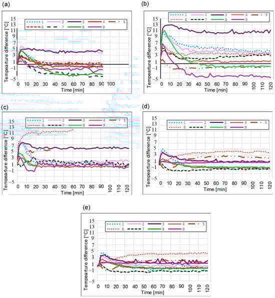 Temperature difference between the render surface and insulation—graphite polystyrene, λ = 0.033 W/(m·K)—(a) Measurement I, (b) Measurement II, (c) Measurement III, (d) Measurement IV, and (e) Measurement V.