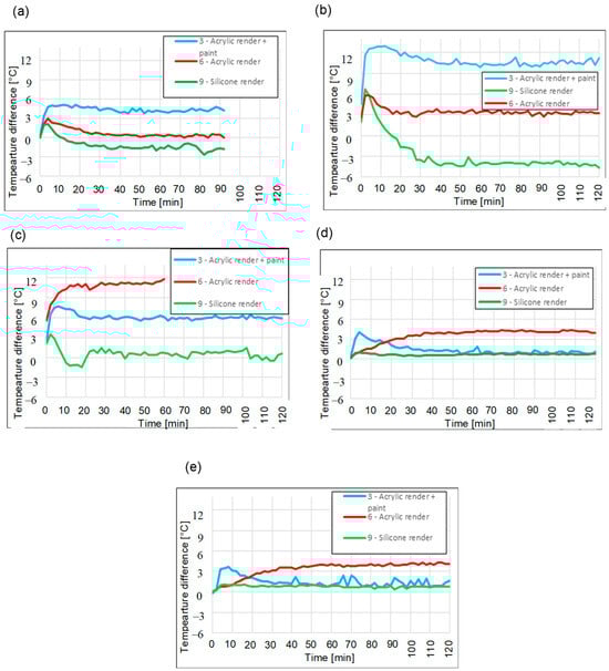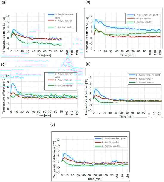Figure 14a–e refers to test fields in which graphite polystyrene was used as an insulating layer. The summary of the five measurement series indicates that when using the more thermally efficient graphite-enhanced polystyrene (λ = 0.033 W/m·K), the measurement results changed slightly. The acrylic render with thermal paint more frequently maintained a high temperature differential, which may suggest its more favorable role in preventing heat loss when paired with graphite insulation.