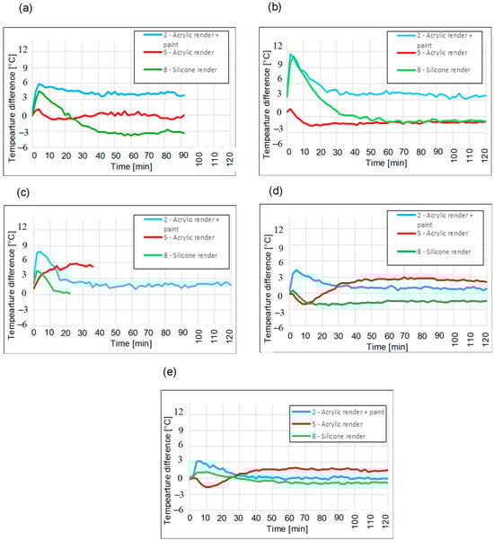 The results for test fields in which white expanded polystyrene with a graphite additive was used as an insulating layer are presented in Figure 13a–e. The acrylic render variant finished with thermochromic paint demonstrated a medium and highest temperature difference—indicating the best thermal properties. The acrylic and silicone render consistently showed low to medium thermal properties.